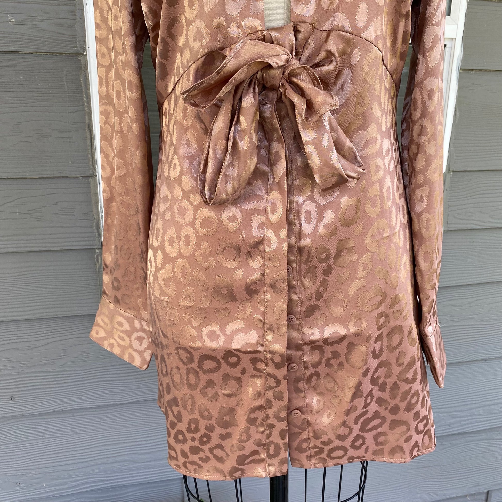 Make a statement with this rose gold leopard print dress. Deep plunge neckline, front ties and button closure. Size Medium. Made in China. 100% Polyester. Brand new with tags!