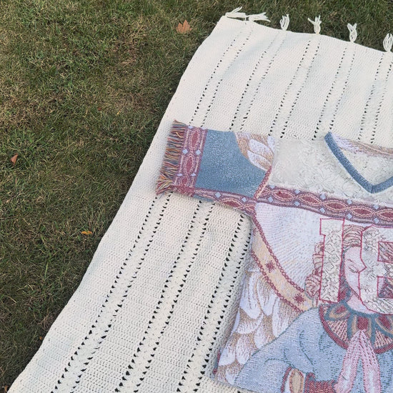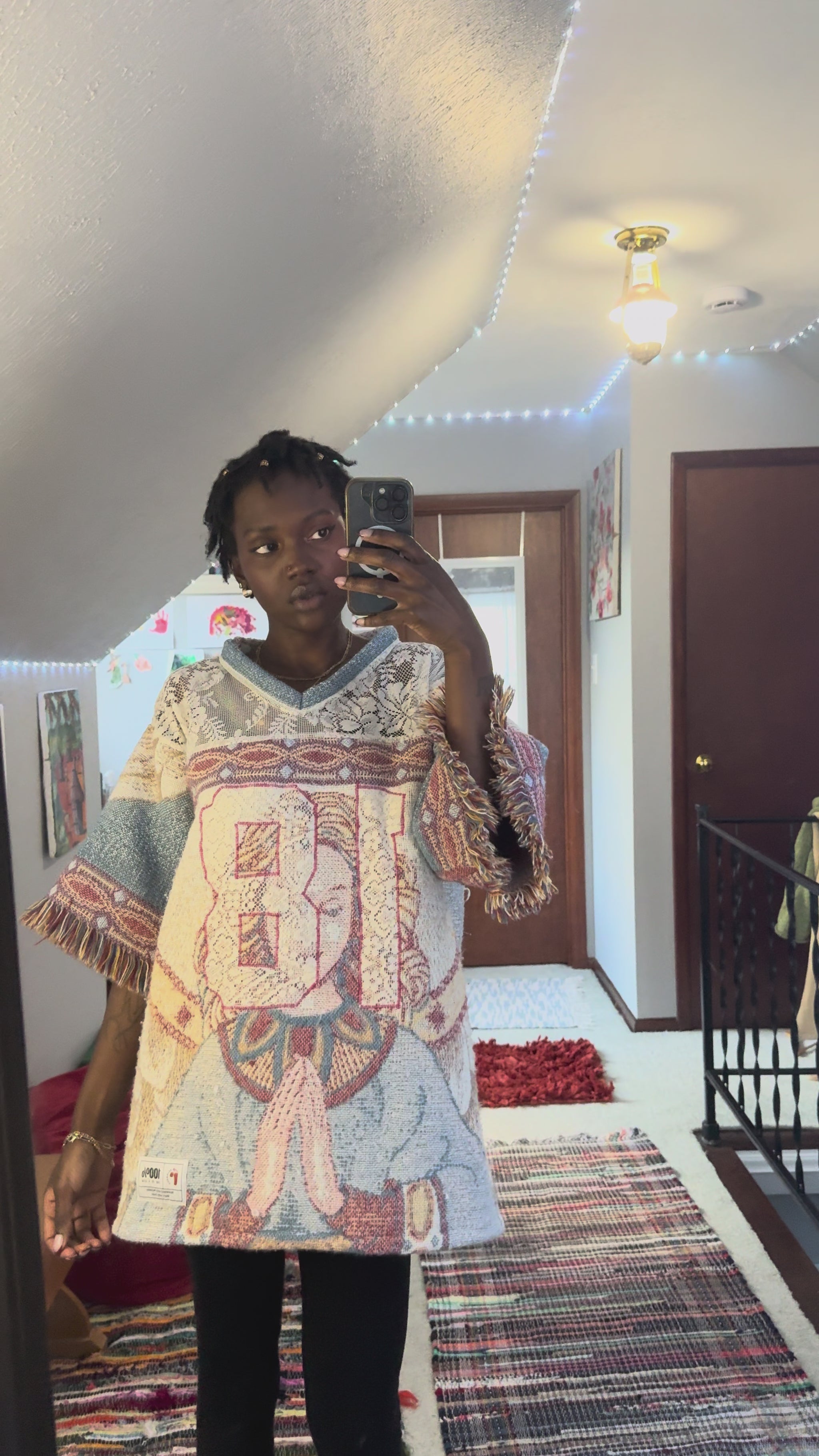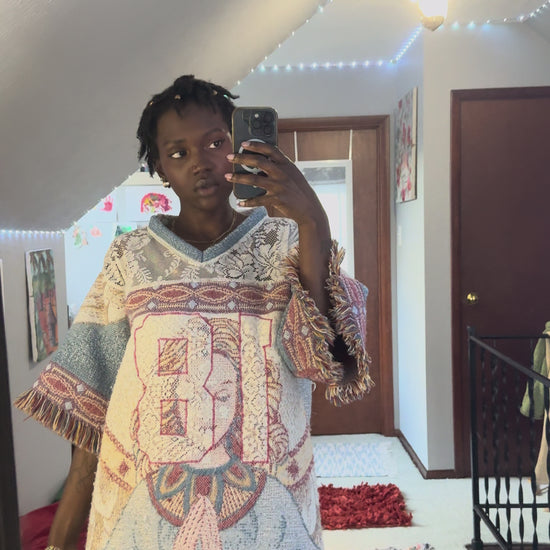 Each jersey is uniquely crafted from thrifted woven tapestry blankets, transformed into a bold statement piece that blends comfort, nostalgia, and creativity. No two are alike! Expect bold patterns, rich textures, and sustainable style with a story.