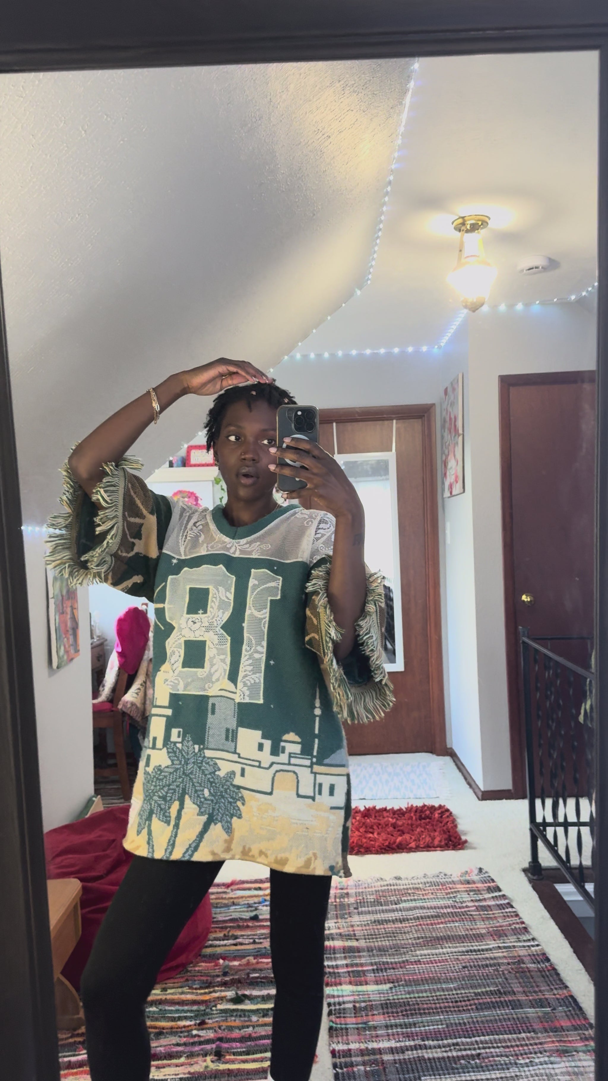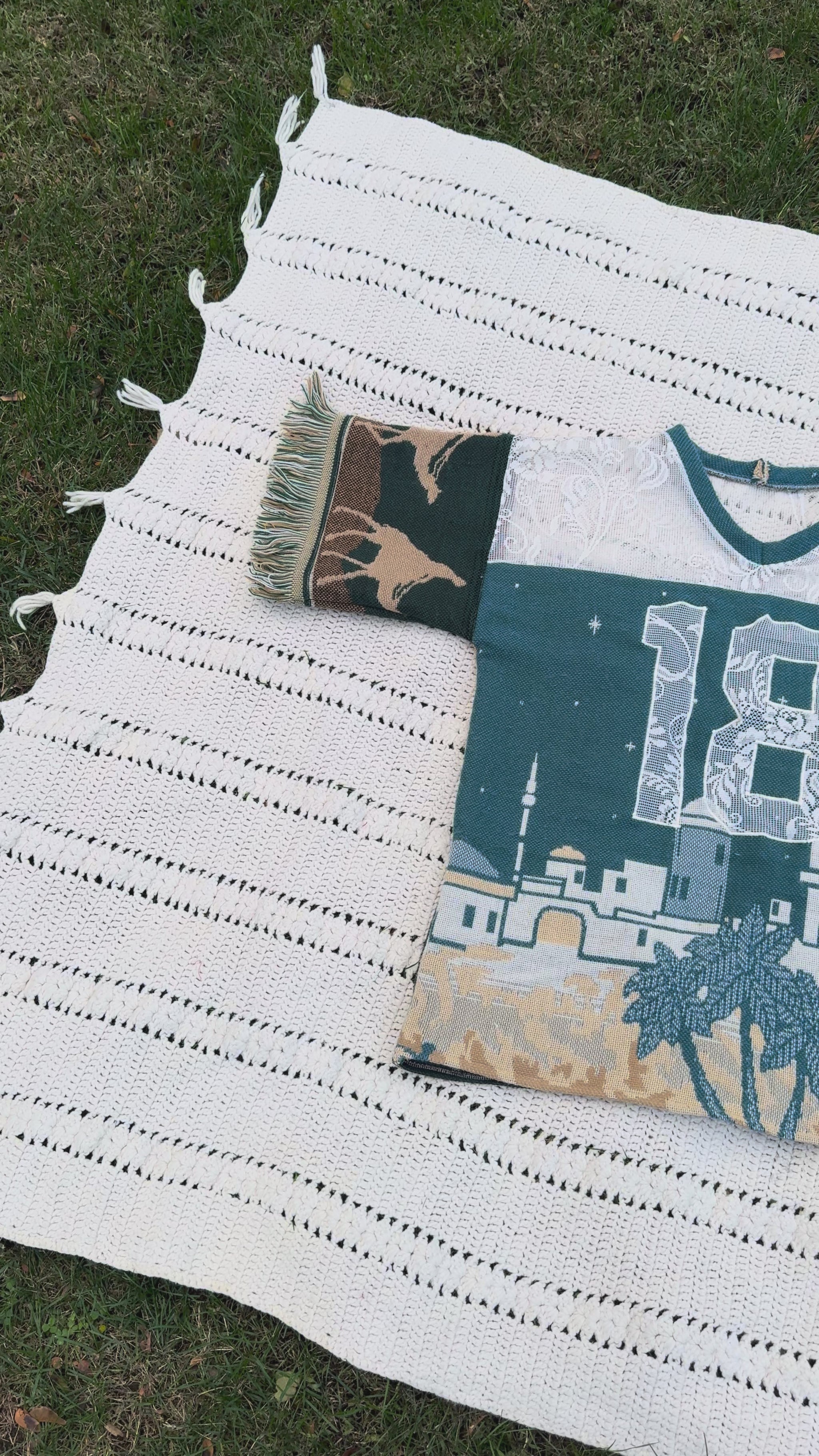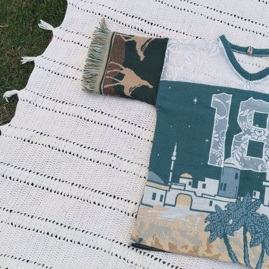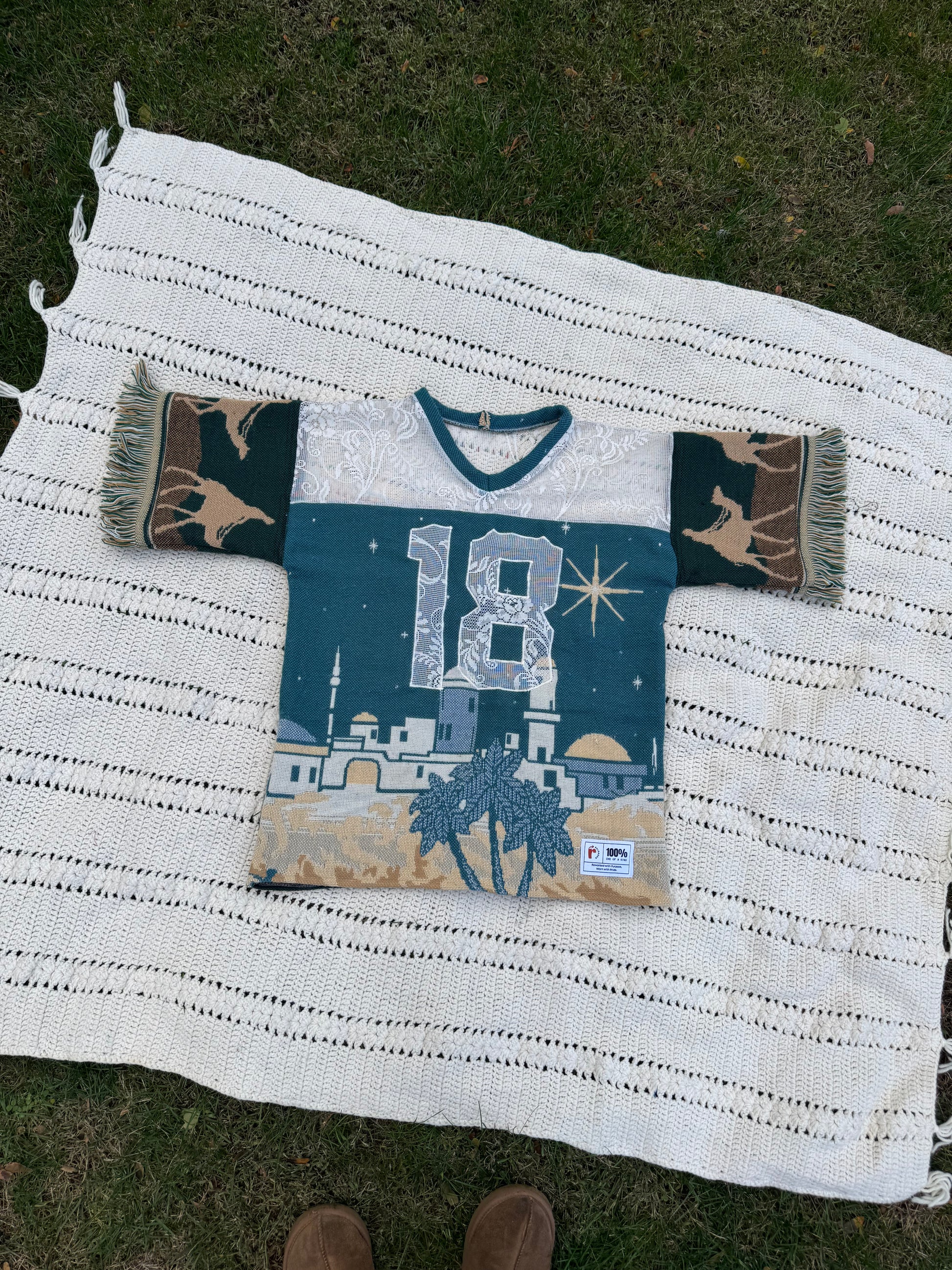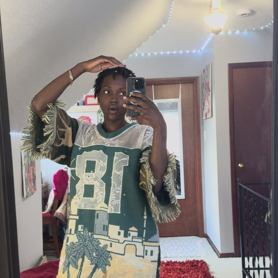 Each jersey is uniquely crafted from thrifted woven tapestry blankets, transformed into a bold statement piece that blends comfort, nostalgia, and creativity. No two are alike — Expect bold patterns, rich textures, and sustainable style with a story.