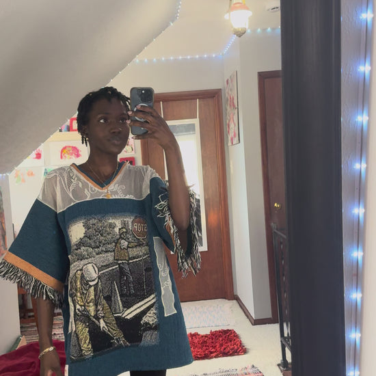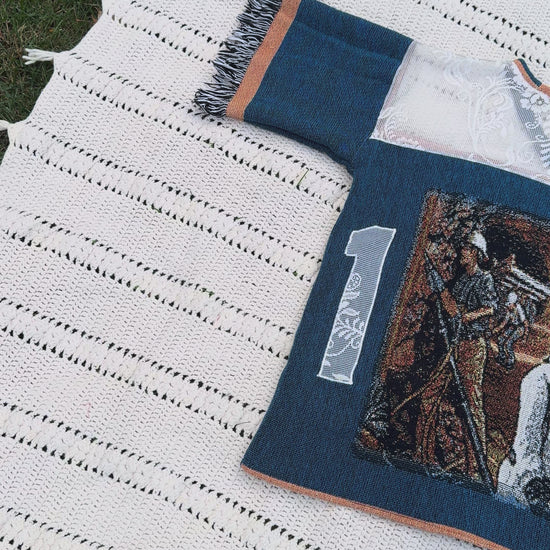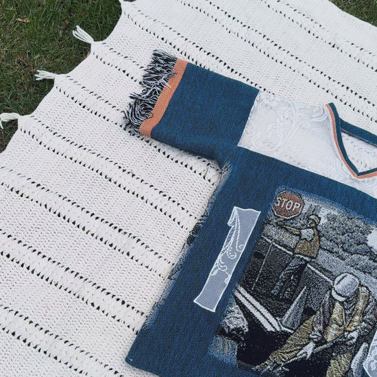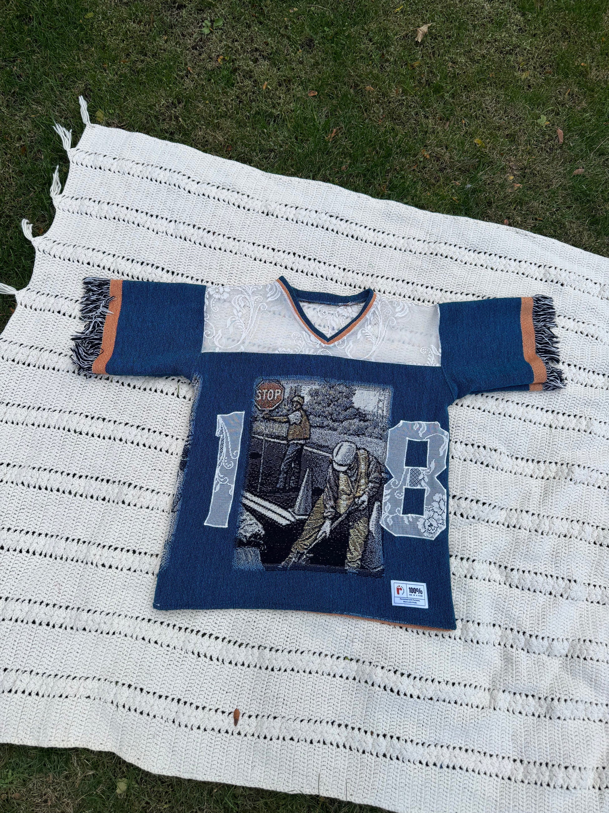 Each jersey is uniquely crafted from thrifted woven tapestry blankets, transformed into a bold statement piece that blends comfort, nostalgia, and creativity. No two are alike — Expect bold patterns, rich textures, and sustainable style with a story.