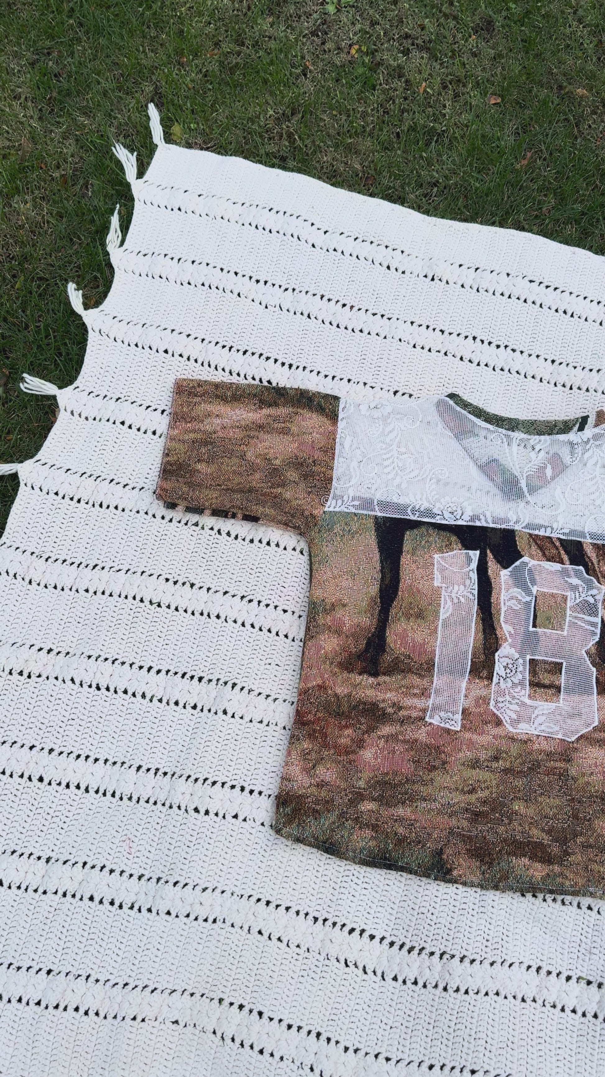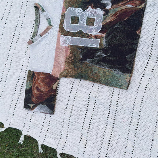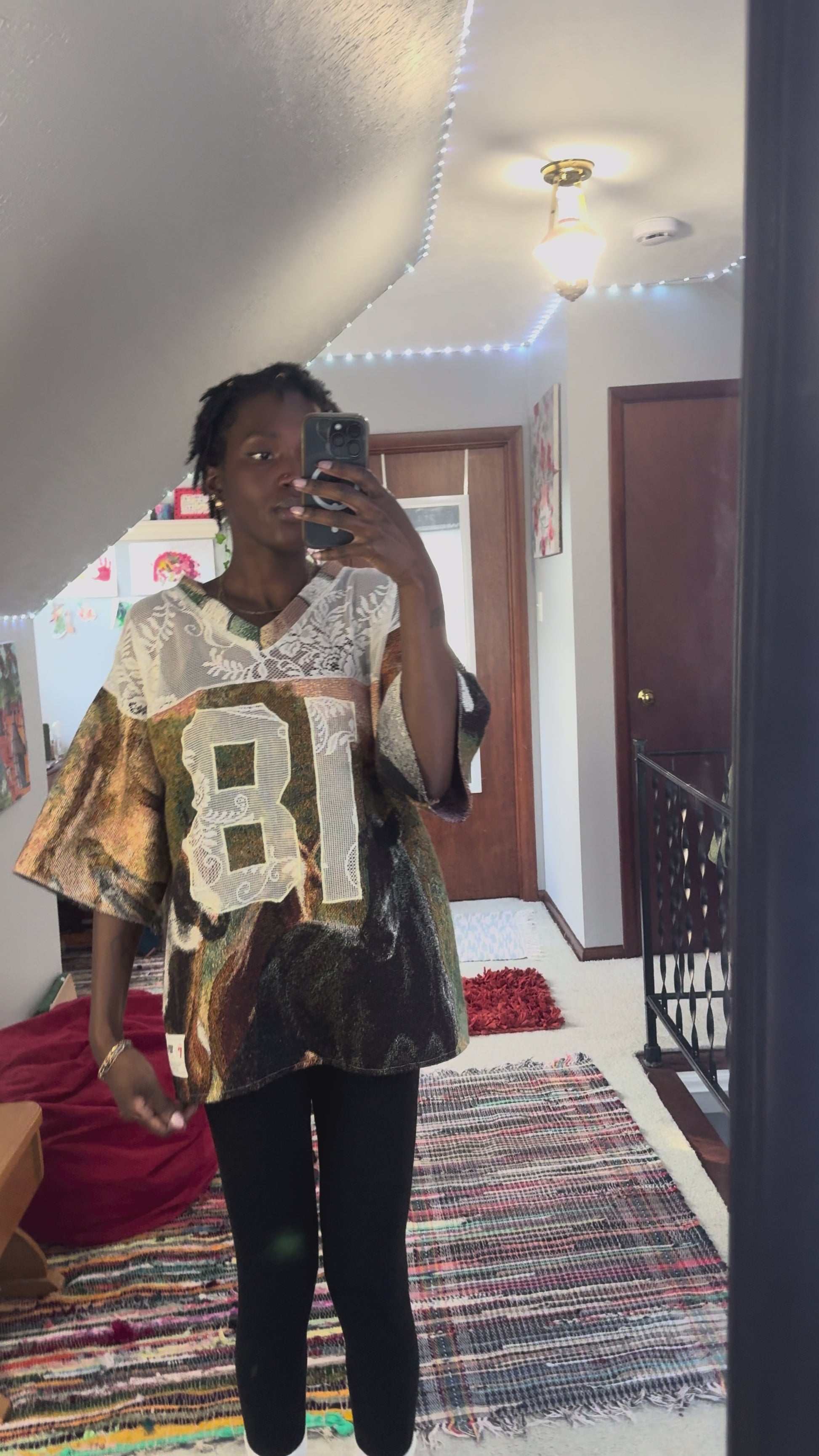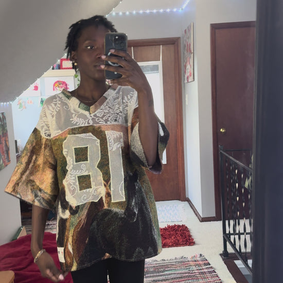 Each jersey is uniquely crafted from thrifted woven tapestry blankets, transformed into a bold statement piece that blends comfort, nostalgia, and creativity. No two are alike — Expect bold patterns, rich textures, and sustainable style with a story.